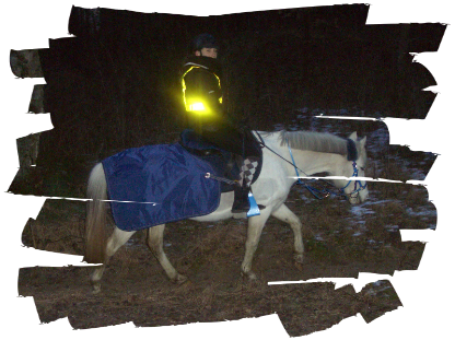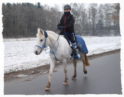 - 24.02.13: Sonntag war ein kleiner Ausritt mit 2 Miteinstellerinnen geplant. Die Besitzerin des Unfallpferdes traute sich verständlicher Weise diesmal noch nicht mit aber R. auf Ihrer Rentnerstute Sugar wollte mit. Da Ich ohne reiten nicht aushielt durfte ich auch mit. Mir gings ja auch wieder gut. Zufällig schneite es an dem Morgen und es blieb sogar etwas liegen, so dass wir zu einem kleinen Schneeausritt kamen *freu*. Hoppi und meine Schwster ritten vorweg, dann R. auf Sugar und ich ohne Sattel auf Hässi. Schwesters Freundi lief zu Fuß mit. Insgesamt waren wir 1:30 Stunden unterwegs und legten 7,8km zurück. Drei Ministrecken sind wir auch getrabt, hat alles gut geklappt. Hässi war ganz brav.
