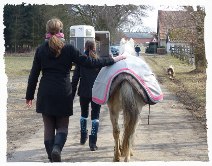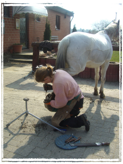 01.03.13: Unseren Freitags-Unterricht hat meine Schwester ja nun gekündigt um auch Freitags wieder auszureiten. Heute hatten wir jedoch anderes vor. Hässi & Hoppi hatten zunächst Ihren Huftermin und Abends hatten wir Karten für das Bremer Pferdefestival in unserer Stadthalle. Da bereits ab 17:45 Uhr Einlass war, nahmen wir bereits den Huftermin um 15 Uhr. Sowohl meine Schwester als auch ich mussten uns sehr beeilen, dass zu schaffen. Pünktlich waren wir am Stall. Zuerst war Hoppi dran und danach Hässi. Ihre Hufe und auchder Strahl waren super, trotz Matschpaddock ud wieder mehr Geländereiten. Da Ponyfreundin C. krank war holten wir auch Ihr Pony Honeymoon zum Huftermin. Er ist eher etwas ängstlich war aber auch brav. Hässi & Hoppi hatten dann Pause und wir fuhren nach Hause und dann zur Stadthalle. Es war zunächst ein Springturnier Klasse S mit Stechen und danach der Schow-Wettkampf der Vereine. Reitvereine aus Norddeutschland führen dann mit Ihren Mitgliedern, Schul- und Privatpferden große Schowbilder/ Pferdequadrillen auf. Diesmal waren es weniger Vereine als sonst und es gab auch weniger neue Ideen. Toll war es trotzdem.
