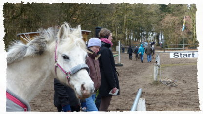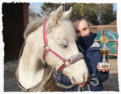 31.03.13: Distanzritt Silberstern 40km alleine mit Hässi ohne meine Schwester und Hoppi, aber meine Schwester und Freundi haben uns dafür getrosst. Da es Nachts sehr kalt war übernachteten wir nicht wie üblich im Anhänger und reisten am Vortag an, diesmal fuhren wir früh Morgens zum Hof und mit Hässi im Hänger hinzufahren. Wir hatten gut geübt, aber ganz zuverlässig ging sie bisher nicht drauf. Die Sachen hatten wir am Freitag schon zusammengepackt. Wider Erwarten ging Hässi sofort und Problemlos auf den Hänger so waren wir früh dran. Noch in der Morgendämmerung luden wir ab und bauten den Paddock auf. Hässi wurde dann geputzt und für die Voruntersuchung fertig gemacht. Zwischendurch hab ich mich noch angemeldet und meine Checkkarte bekommen. Die VU war auch super, Puls 40 Hässi trabte sogar einwandfrei vor ohne Passgang *freu*. Kurz nach 9 war der Start. Ich startete mit 2 anderen Ponys und blieb auch 2/3 der Strecke in der Gruppe. Man konnte trotz Wintertemperaturen gut reiten. Teilweise gab es vereiste Stellen, da musste man Schrittreiten. Die erste Kontrolle war auch super. Hässi musste nicht warten, stand super brav und Puls 40. Dann ritt ich ein Stück im Schritt alleine aber die anderen Ponys holten schnell auf und ich schloss mich wieder an. Hässi ließ sich immer gut halten, aber von Ihrem gezappel rutschte der Sattel 2 Mal zs dass ich auch mal absteigen musste. Meine Schwester half dann in einem Stopp beim richten. Dadurch verlor ich den Anschluss an die anderen Ponys und stand nachdem noch 3 weitere Gruppen uns eingeholt hatten als ca. 10tes Paar an der 2ten TA Kontrolle. Natürlich wartet dann auch keiner aber Hässi war auch hier brav. Puls 44 und vortraben an der Hand lief auch gut. Meine Schwester half mir dann schell hoch und im Galopp holte ich zumindest meine Vorreiter wieder ein. Da die anderen nach uns gestartet waren und ich ncht mehr soviel Zeit hatte musste ich überholen und schneller weiterreiten. Dies hat dann auch geklappt. Das letzte Stück musste Hässi recht schnell laufen u auch viel Galoppieren. So schafften wir es mit 4 min erspätung und somit 4 Strafpunkten ins Ziel. Im Ziel hatten wir dann 10min bis zur Messung. Hässi wurde gut eingedeckt, Gurt gelockert und sie trank auch brav. Pulsmessen war dann schwieriger, die Pulsmesser hörten nichts ;-) aber nach einigen Versuche war der Superpuls von 40 gefunden *freu*. Somt hatten wir nur 4 Pulsfehler über 40 und 4 Zeitfehler = 8 insgesamt. Nach 2 Stunden war die Nachuntersuchung Hässi wurde zwischezeitlich Dick eingepackt, damit die Muskeln warm und locker bleiben. Hat wohl gut geklappt. Alles super und sie ist wieder sehr gut vorgtrabt. Dann waren wir gespannt auf die Siegerehrung. Waren andere auch so gut im Puls und war ich als einzige zu langsam? Zwischen Nachuntersuchung und Siegerehnrung wollten wir Hässi noch schnell verladen. Das Verladen nach Hause lief auch sehr gut, nach 2 mal Rampe rauf/runter stand sie oben. Wir fuhren zum Hof, luden ab, brachten Hässi auf den Paddock, parkten den Hänger und fuhren wieder zur Ranch. Nachdem wir fast die Siegerehrung verpassten klärte es sich schnell auf.... wir hatten den 1sten Platz. Zwar waren wir als einziges Paar zu langsam, aber keine hatte so gute Pulswerte wie Hässi *freu*. Später fuhren wir nochmal zum Stall und es gab dann noch Futter.