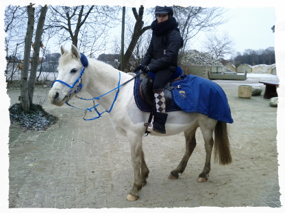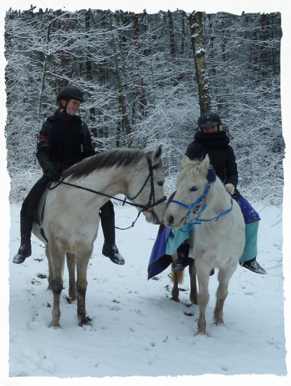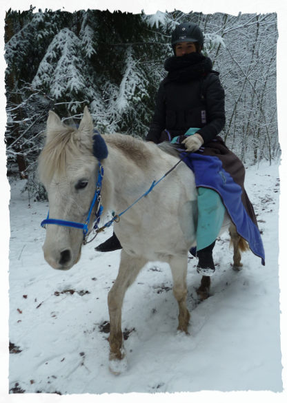10.03.13: Wir hatten einen Schrittausritt mit Miteinstellern geplant. Zu unserem Glück hatte es den ganzen Morgen geschneit und so hatten wir einen tollen Schneeausritt. Ich ritt Hässi ohne Sattel, hab mir eine Abschwitzdecke umgewickelt und eine hinten drüber gelegt, es war trotzdem sehr kalt.