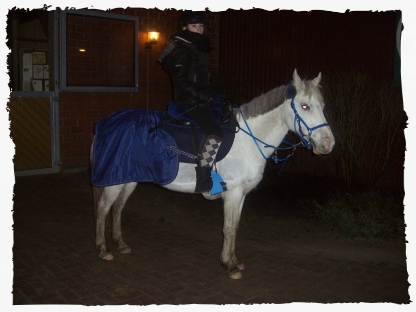 01.01.13: Neujahrsreittag. In den letzten Jahren hatten wir immer einen Neujahrs-Ausritt gemacht, aber vom Wetter und den Bodenverhältnissen ging das diesmal garnicht (Landunter mit Regen). So fuhren wir Abends wie gewohnt zum Reiterhof und ritten zur Zeit unserer normalen Reistunde in der Halle. Nur war kaum jemand am Stall, da ja heute kein richtiger Betrieb war. Das war auch mal ganz schön. E. mit Ihrem Pferd Mikas war auch wieder dabei. Ih ritt Hässi ohne Sattel. Sie war brav und lief zufrieden und sprang auch gut über das kleine Stangenhindernis. Am Ende durfte ich nochmal auf Mikas. Erst etwas Galopp und dann hüpften wir nochmal nen kleinen Sprung. Hat er auch brav gemacht. E. war auch zufrieden.