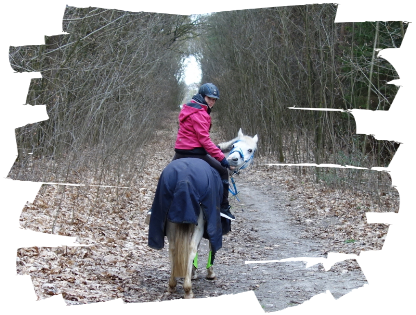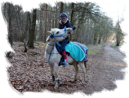 - 24.01.2016: Heute wollten wir nochmal in Gelände. Miteinstellerin E. war auch dabei. Ich ritt mit Hässi vorne. Gleich beim Verlassen des Hofes mussten meine Schwester und ich jedoch schon wieder absteigen. Erst nervte der Hengst vorne auf dem Paddock und galoppierte wild neben uns her, das ging aber noch. Danach kamen wir noch an der Ponyweide vorbei wo dann plötzlich auch 4 oder 5 Ponys wild rumgaloppierten. Immer auf uns zu bis zum Zaun und dann ganz schnell wieder weg. Da bin ich dann runter weil Hässi schon komisch wurde und wollte dann später im Gelände wieder aufsteigen. Nach der Straßenüberquerung im Wald stellte sich dann Häska dann richtig blöd an und tänzelte, schorchelte und stieg auch mehrere Male. Das hat sie noch nie gemacht. Als wir es dann geschafft hatten dort wegzuführen beruhigte sie sich auch wieder und ich konnte wieder aufsteigen *Böses Pupsi*. Ansonsten war sie brav und wir sind im Wald auch noch alleine einen Hügel hochgetrabt. Hat sie auch gut gemacht.