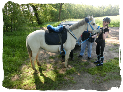09.05.2014: Erst hatte ich Springen mit Schulpferd Salvaro. Danach war es schon recht spät und ich musste schnell noch Häska fertigmachen. So machten meine Schwester und ich zusammen mit Ponyfreundin C. nur einen kleinen Schrittausritt mit etwas Trab von etwa 70min in unserem Wald. Häska durfte dabei nach vorne. Ich ritt wieder mit der S-Hack und ohne Sattel, was auch gut klappte.
