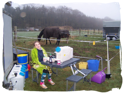 24.03.2012: Am Nachmittag fuhren wir mit der ganzen Familie zum Stall. Am 25.03 haben wir die Silberstern Distanz über 40km genannt. Meine Schwester und ich machten Hoppi und Hässi fertig und ritten zur 8km entfernten Silberstern Ranch. Ich ritt Hässi ohne Sattel. Vorher wurde noch der Pferdeanhänger beladen und dann fuhr unsere Familie vor um alles aufzubauen. Wir wollten dann im Anhänger schlafen. Bei der Ranch angekommen brachten wir die Pferde in Ihre Paddocks und bereiteten den Anhänger für uns vor und sortierten alle Sachen. Dann liefen wir erstmal zur Anmeldung und putzten unsere Pferde nochmal für die Voruntersuchung. Unsere Familie fuhr dann schonmal nach Hause. Erst war Hoppi dran, lief alles gut, nur beim Vortraben ist er einmal gestiegen. Hässi war diesmal auch nervöser und hatte einen höhren Puls als sonst (52). Es war eine nette Tierärztin vor Ort, die fand Hässi auch total knuffig. Beim Vortraben lief Hässi wieder mal komisch (keinen richtigen Trab), aber nicht lahm. Wurde auch so in der Check-Karte vermerkt. Wir schrieben dann noch nach Hause das alles ok war und bereiteten unser Abendbrot mit dem Gaskocher vor. Dabei merkten wir, dass wir alles an Geschirr und Besteck vergessen hatten. Unser Papi hat uns dann gerettet und kam nochmal rumgefahren. Es wurde richtig rchtig kalt (vielleicht 2 Grad) und windig und das Wasser wollte nicht recht heiß werden. Für die Nudelsuppen und eine heiße Schokolade hats aber gereicht. Danach fütterten wir die Pferde nochmal und guckten dann im Anhänger noch eine DVD und schliefen dann in unsere Schlafsäcke gekuschelt ein.