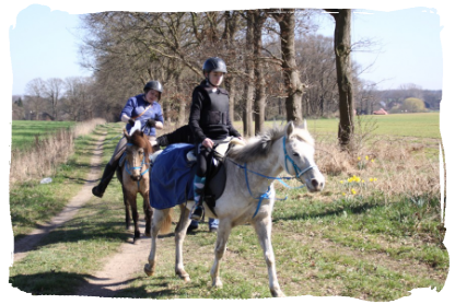 22.04.2012: Meine Schwester und ich waren heute mit Freundin J. und C. für eine gemütliche Runde verabredet, auf dem Hinweg regnete es doll aber danach bleieb es trocken. Ich durfte dann auf dem Ritt wieder nach vorne und Hässi ging auch gleich besser vom Hof als am Freitag. Meine Schwester ritt ganz hinten. Wir ritten ins Naturschutzgebiet Wawer Sand. Dorthin muss man über eine Landstraße mit Schlafampel, auch hier ging Hässi vorbildlich hin so dass ich drücken konnte. Im Gelände trabten wir dann immer mal kurze Strecken und ich bin mit Hässi auch wieder über den Baumstamm gesprungen *freu*. Auf dem Rückweg dann ein großer Schreck wir trabten gerade los da rief meine Schwester schon stop. Wir stopten alle und ein buckelnder Hoppi kam von hinten. Nach einigen Hüpfern rutsche der Sattel nach vorne und meine Schwester konnte sich nicht mehr halten und fiel bös auf den Kopf. Sie konnte dann aber gleich wieder aufstehen und Hoppis Zügel und Sattel richten. Sie wollte dann zur nächsten Bank zum aufsteigen. Weil es aber doch zu weit war und ihr der Fuß wehtat stieg ich ab und half Ihr hoch. Normalerweise komme ich dann auch schlecht auf Hässi weil der Sattel rutscht aber heute kein Problem *freu*. Wir ritten dann im Schritt weiter mit mir vorn und meiner Schwester dahinter. Ich durfte auch auf dem Rückweg nochmal übersn Baumstamm *freu*. Da wir spät dran waren wollte meine Schwester noch etwas traben, sie ging dann nach vorne und es klappte auch. Danach kam Hässi wieder vor, lief auch brav an der Straße bis zur Ampel und weiter Richtung Hof. Dann trabten wir auch nochmal mit meiner Schwester vorne. Kurz vorm Hof machte Hoppi dann nen Seitenhüpfer und sie viel nochmal, aber diesmal seitlich auf nen weichen Acker. Außer dass ich ihr nochmal hochhelfen durfte war nichts passiert und auch hier hielt Hässi Sattel beim aufsteigen vorbildlich. Am Hof machten wir dann die Pferde fertig, meine Schwester schaffte es auch ohne Hilfe. Vor dem Paddock knipsten wir uns dann noch gegeseitig und fuhren danach nach Hause.