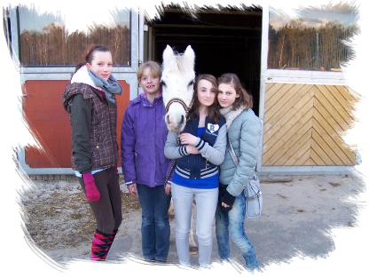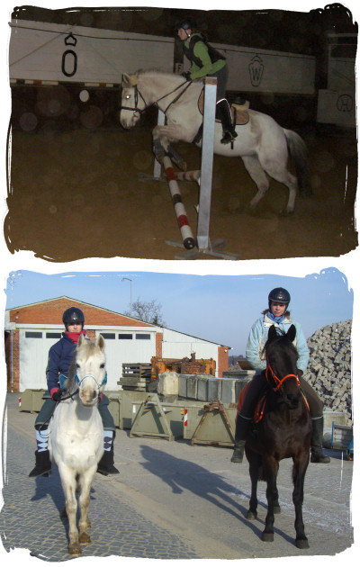 14.02.2012: Da meine Schwester Urlaub hatte waren wir früher am Hof. Sie wollte vor Hoppi noch ein anderes Pferd reiten. So ritt ich Hässi auch in der früheren Stunde mit Freundin C. und J. ohne Sattel. Am ende sind wir dann noch übers Cavaletti und Calavetti mit Stange. Hässi ist auch mal vorbei gedüst aber hat sie sonst gut gemacht. In unserer eigentlichen Stunde durfte ich dann nochmal Schulpferd Salvaro reiten. Hat auch wieder Spaß gemacht und unsere RL hat mich auch gelobt, da er zemlich bockig war und auch öfter abgedüst ist und gebuckelt hat. So durfte ich aber viel Galoppieren und auch übers Cavaletti hüpfen ;-)