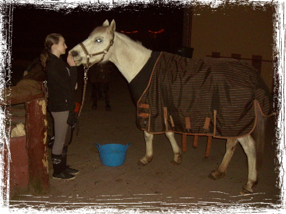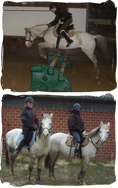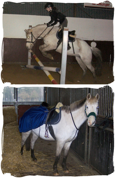 10.01.2012: Hoppi hatte 3 warme Fesseln und Hässi eine, so haben wir die beiden nicht geritten. Ich durfte dann im Unterricht ein Schulpferd reiten (Salvaro) *freu*. Es war ein großer Unterschied zu Hässi (ca. 30 cm größer) lief aber gut. Konnte auch schön galoppieren und wir sind auch über Bodenstangen in Trab und Galopp. Zweimal wollte der Herr zwar etwas buckeln aber alles gutgegangen. War eine echte Sternenstunden (leider ohne Hässi). So sieht man aber mal dass man doch gut reitet *freu* Hässi ist eben nicht so gut ausgebildet aber wir werden auch besser.