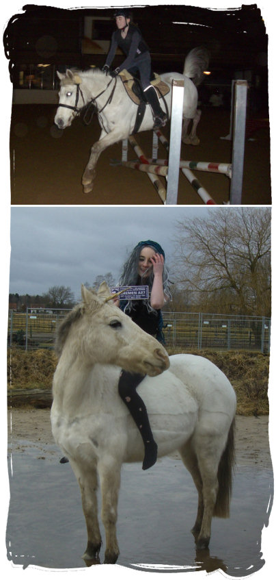 17.02.2012: Zuerst wieder Springstunde mit Hässi. Meine Schwester hat Bilder gemacht. Freundin B. war auch mit um Ihr Lieblingsschulpferd zu Putzen. Die Springstunde war ok, ich war nur muffelig da mein Sitz und meine Knie einfach nicht so gut sind. Am Abend dann wieder Unterricht mit Sattel und Dreickeszügeln. Lief richtig gut, unsere RL hat uns wieder gelobt. Freundin B. durfte beim Warm- und Trockenreiten auch noch auf Hässi.