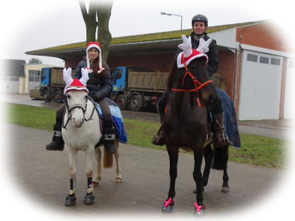- 10.12.2016: Heute war Weihnachtsfeier am Stall. Ich wollte ein Spiel mitmachen mit Salvaro und mit Hässi am Ende den Weihnachtsmann als Engel begleiten. Vorher sind wir jedoch noch ausgeritten, da wir noch unsere Hufschuhe weiter testen mussten. Hässi lief jedoch wieder so verhalten damit, dass wir sie vor den Trabstrecken auszogen und meine Schwester sie in die Tasche steckte. Hässi lief dann aber gut weiter und wir sind eine schöne Runde durchs Gelände getrabt und sie hat auch schön abgeschnaubt und war Stellenweise sogar zu flott für Hoppi im Trab. Am Stall kam sie dann wieder in Ihre Box und wir machten Salvaro fürs Springen fertig. Da das Testspringen am Vortag nicht ohne Probleme lief hoffte ich einfach auf ein Durchkommen. Meine Schwester war Läufer bei dem Spiel für uns. Salvaro war recht angespannt, hat den Pacour dann aber gut gemeistert. Zwar sprangen wir alles bis auf das Letzte mehr aus dem Trab aber dafür sind wir überall drüber ohne große Umwege oder Verweigerer. Da wir den Pacour geschafft hatten konnte meine Schwester noch Ihren Pacour mit Schubkarre und Ball absolvieren und wir hatten alles geschafft *freu* und am Ende sogar Platz 3 von 9. Danach machten wir Hässi für das Engelsreiten fertig und die nette C. machte Salvaro fertig und brachte ihn in die Box. Hässi bekam Lametter in Schweif und Mähne und ein goldenes Horn, sie war also ein Engelseinhorn. Sie war auch lieb hatte aber keine rechte Geduld und war wohl froh als alle Geschenke verteilt waren ;-)