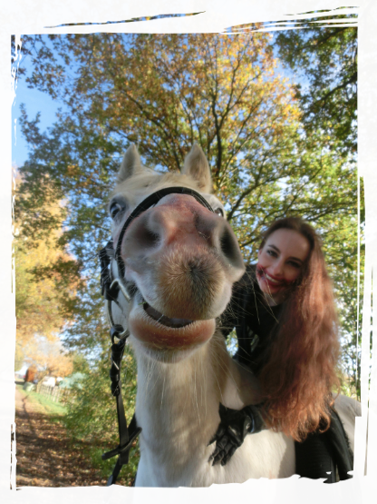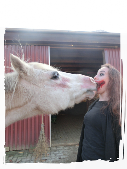 - 08.11.2015: Heute haben wir ein bischen Halloween nachgeholt und eine kleine Geländerunde durch den Ort mit unseren gruselig geschminkten Gesichtern gemacht (ca. 70min). Ich hab Hässi ohne Sattel und mit Trense geroitten. Am Anfang kam sie nicht gut in Gang da sie wieder Verspannungen in der Hinterhand hat, aber nach einer weile lief sie sich gut ein.. Vor und nach dem Ritt durften Hoppi & Hässi auf dem Springplatz grasen, das fanden sie super da die Weidesaison ja vorbei ist. Sie haben sich dort auch beide einmal gewälzt.