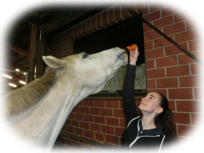 - 14.11.2014: Freitagsstunde mit Hässi. Zuvor haben wir nach dem Putzen wieder ihre Übungen gemacht. Das Ohrenabstreichen mag sie am liebsten, da wird sie gaaanz müde. Etwas mehr als die halbe Stunde ritt ich mit Pad und danach noch ohne. War heute keine Sternenstunde aber ganz ok. Wir waren zu 6 in der Halle und heute ritten sich irgendwie alle im Weg. In der einen vorderen Ecke saß zudem ein Monster (grüner Springblock mit Decke drauf) bei dem Häska nicht lang wollte. Am Ende ging es noch über eine cavalettihohe Stange. Hier wurde Pupsi wieder zu flott und ich musste läger im Schrit drauf zu und dann erst los, so ging es. Danach war noch eine andere Reitstunde um Pupsi hatte Pause. Um kurz nach 21 Uhr ging meine Schwester noch mit Hoppi in die Halle zum longieren und ich für Bodenarbeit mit Pupsi. Hat sie heute richtig gut gemacht, vorallem auch die Seitengänge. Vorallem hat sie heute alleine den Kof am Ende der Übung abgesenkt und lange dort gehalten. Am Ende hab ich die Seitengänge noch zu reiten versucht. Nach links klappte es schon recht gut, nach rechts wollte sie nicht so recht. Ich bin aber schon stolz wie gut sie sich mittlerweile drücken lässt und auf die Schänkel reagiert.