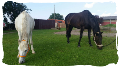 - 28.08.2015: Heute hatten wir einen ruhigen Tag geplant. Zuerst holte ich Hoppi aus der Box. Er war seit ca. 7 Stunden drin, aber ganz ruhig und brav. Zuerst gingen wir zum Krankenpaddock mit Hässi grasen. Nach 35 min gingen wir mit beiden in den Vorraum und hängten Ihnen noch Heunetze hin. Hässi bekam Ihren Kompressionsstrumpf an und ich machte zwischenzetlich Wasser und Heunetze für die Beiden. Danach gingen wir mit Beiden ein Stück die Straße am Hof hoch und runter und dann auf die hintere Weide wo beide nochmal ca. 30 min grasen durften. Hässi hat sich sehr gefreut und sich erstmal im Gras gewälzt und Hoppi war auch sehr friedlich. Danach ging es für Hässi nochmal zum Vorraum ans Heu und Hoppi durfte auf dem Springplatz noch kurz an die Longe. Im Anschluss bekamen beide Ihr Futter und Hässi kam ohne Strumpf wieder auf den Krankenpaddock und Hoppi auf die Weide.