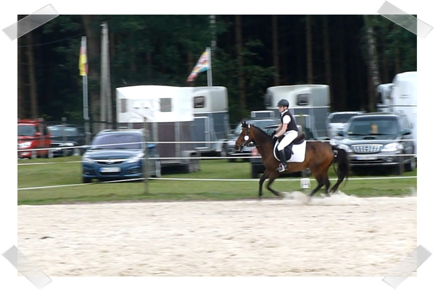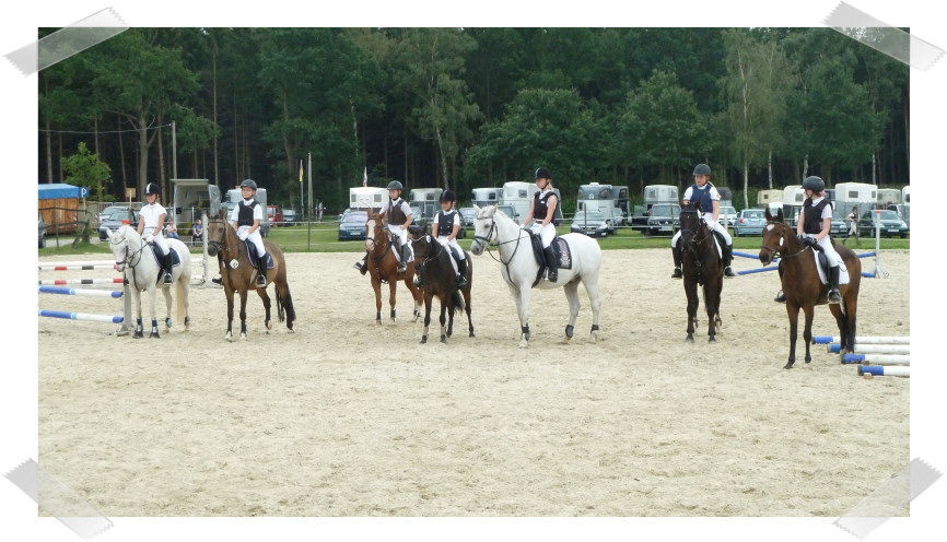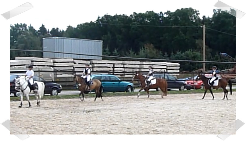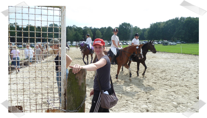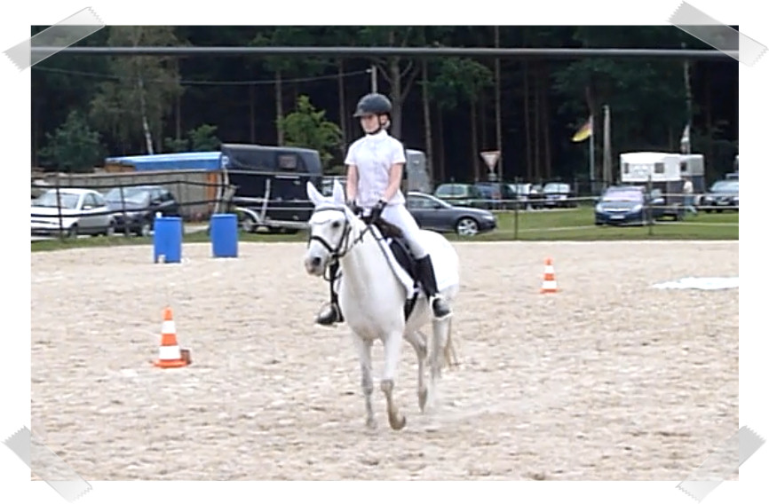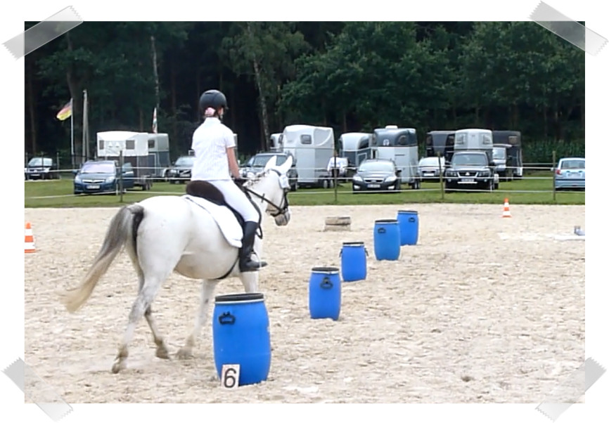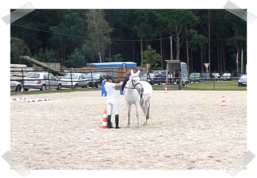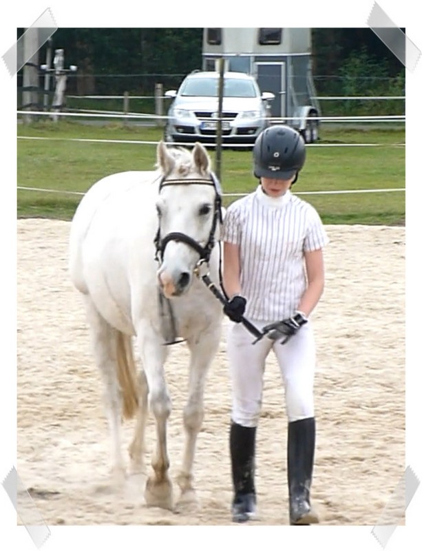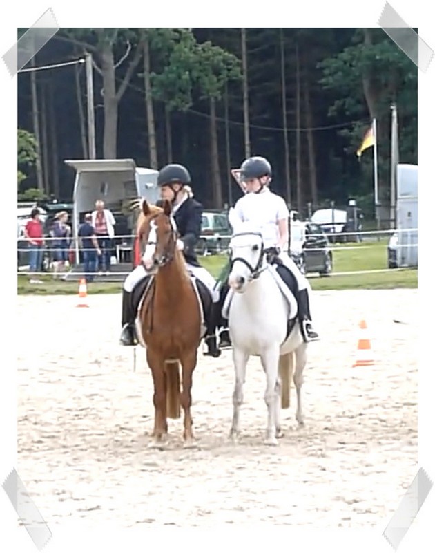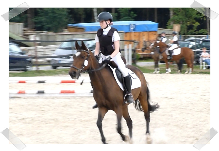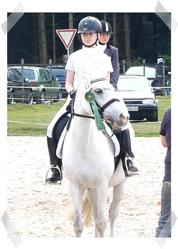Wir ritten an letzter Stelle einer 10er Abteilung. Vorne war leider ein kleines total langsames Pony so dass sich die Abteilung immer wieder staute. Häska war kaum an ihrem Platz zu halten und sehr aufgeregt. Sie lief auch die ganze Zeit im Pass. Am Ende dann 8te von 8 mit Note 6,5, da es ja auch nur auf meinen Sitz ankam. Die Richterin meinte ich säße gut, aber sie konnte den Trab nicht bewerten da Häska ja keinen zeigte, blöd.