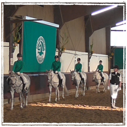 Alle meinen dass wir von der Note her besser waren, aber wir sind als letzte Mannschaft gestartet und da wird man eben zwischen die Noten der anderen sortiert. Platz 3 hatte 6,5, Platz 2 6,6 und Platz 1 jedoch 7,2. Wir ritten auch alle mit Hilfszügeln, ohne wurde besser gewertet und wir hatten wg. Zeitverzug auf dem Turnier keine Zeit mehr für Bandagen und sonstige Accessoires. Ich ritt mit dem kleinsten Schulpony der Gruppe (Helena) ganz hinten. Die Schulponymannschaft bestand aus Lisa (Racker), Joana (Honey Girl), Patricia (Sir Henry), Mir (Helena).