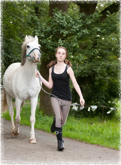 29.04.2012: Am Stall angekommen ließen wir die Pferde noch auf der Weide grasen, da diese grad erst aufgemacht wurde. Hoppi und Hässi kamen danach brav mit, obwohl sie noch nicht lang drauf waren und Hässi folgte mir sogar ohne Halfter und ohne Versuch weiterzufressen *freu*. Sie bekamen dann beide Ihr Hartog-Grasmix und wir putzten fleißig und sattelten dann. Freundinnen C. und J. waren auch wieder dabei.Ich ritt erstmal vorne und Hässi ging heute ganz ohne Diskussionen vom Hof *freu*, nur auf dem Weg zur Straße musste ich mich 3 mal etwas durchsetzen, aber nichts im Vergleich zu früher. Für die Trabstrecken ging meine Schwester nach vorne. Hoppi war sehr flott heute. Im Schritt durfte ich wieder vor, was Hässi auch ganz brav machte. Auch auf dem ganzen Rückweg war ich vorne und Hässi ist nicht einmal angehalten *braves Pony*. Am Stall durften sich die Beiden dann auf dem Außenreitplatz wälzen und danach gabs noch Futter und Sie durften wieder auf die Weide. Schade ist momentan nur, dass Hässi nicht mehr so schön weiß ist sondern eher grün, aber sie ist auch so zufrieden und so kommt mein aktuelles Fellspray mit Heu-Dusft eben öfter zum Einsatz ;-)