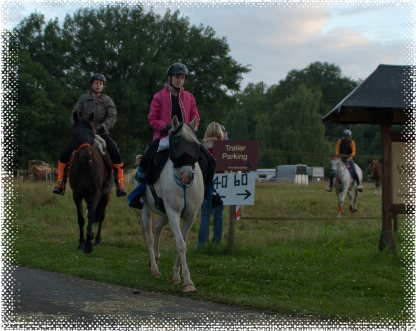 20. bis 22.07.2012: Windpferde-Distanz. Wir ritten am Freitag die knapp 10km zum Windpferdehof in Pestinghausen. Schwesters Freundi hatte unsere Sachen im Hänger bereits vorab hingefahren und uns unsere Paddocks aufgebaut. Dort angekommen machten wir die Pferde fertig, räumten schonmal ein Teil der Sachen zusammen und gingen zur Meldestelle und danach zur Voruntersuchung. Hoppi war sehr nervig, mit Hässi klappte alles gut, sogar das vortraben. Wir bauten dann noch unser Zelt auf und räumten weiter Sachen zusammen bis zur Vorbesprechnung mit Abendessen (Grillen etc.). Wir schliefen dann im Anhänger. Wir hatten 82km genannt, der Ritt startete als Massenstart um 6 Uhr. Obwohl wir eigentlich früh genug anfingen waren wir die letzten am Start, aber es klappte alles noch rechtzeitig. Hässi und ich ritten vorweg und Hoppi hinterher. Hässi wollte allerings nur Galopp oder Schritt und bremste auch öfter Mal, so dass meie Schwester mit Hoppi nacher doch vorne ritt. Die ersten 20km brachten wir flott hinter uns, auf der Stecke gab es einen Trott-By (eine Kontrolle mit vortraben). Nun am Hof die erste Pulskontrolle mit Vortraben. Leider hatte Hässi Gurtdruck und ich durfte mit Sattel nicht weiter. Ich war total unglücklich ritt dann aber ohne Sattel weiter. Nach 30min Pause am Paddock ritten wir auf die nächste 20km-Runde. Bei 40km am Hof die nächste Pulskontrolle mit Vortraben. Alles ok. Nach wieder 30min Pause ging es auf die 3te 20km-Runde. Meine Schwester meinte da schon dass wir bei 60km aufhören weil sie diesmal so kaputt war. Ich hätte wohl noch gekonnt, obwohls ohne Sattel auch sehr anstregend war. Bei der Kontrolle nach 60km am Hof beendeten wir den Ritt vorzeitig in der Wertung. Die Nachuntersuchung war dann nach 2 Stunden. Wir versorgten die Pferde. Schwesters Freundi hatte uns auf den letzten 20km super getrosst. Die Nachuntersuchung war auch super, bei Hässi waren alle Werte gut und auch die Scheúerstelle war wieder zu. Abends war dann die Siegerehrung und wir grillten noch schön mit. Wir schliefen dann noch eine Nacht im Anhänger. Am nächsten Morgen räumten wir dann mit Schwesters Freundi alles zusammen, frühstückten noch und ritten dann die knapp 10km wieder zu unserem Hof. Ich wieder ohne Sattel. Hier ritt ich mit Hässi vorne, diesmal klappte es gut und sie konnte sogar flott traben. Hat Spaß gemacht, aber ich hatte noch Muskelkater in Rücken.