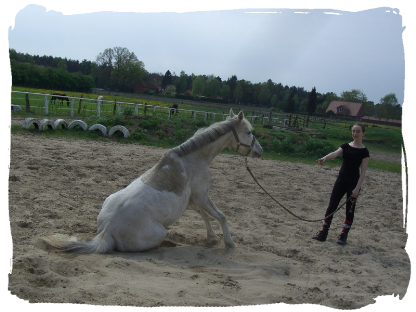 08.05.2012: Abendstunde auf Hässi. Zunächt Hässi von der Weide geholt. Sie ist so lieb, kommt ohne Halfter mit zu Tor, aus dem Tor und wartet und läuft mit bis zu Stallgasse und dann halfter ich zum anbinden auf :-). Heute ritten wir auf dem Außenplatz (Dressurplatz am Wasserloch. Die Reitstunde war ganz ok, Hässi war nur etwas zu flott bzw. hatte öfter Gangsalat (Passlopp, Trablopp oder Trapass ), dafür hatte sie auf der schlechten Hand aber nur einmal Außengalopp und auch das Springen über die 2 Cavaletti hintereinander und den Buschsprung am Ende klappte gut wenn auch teils mit Gangsalat. Durchs Wasserloch lief sie brav, auch im Trab.