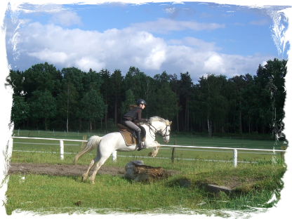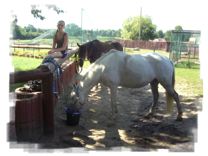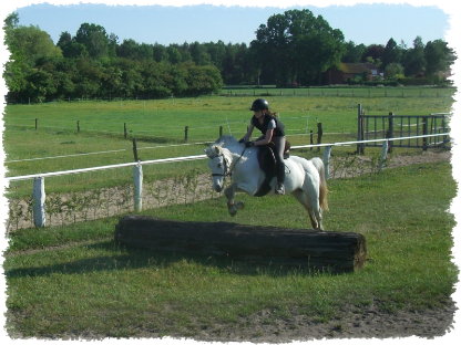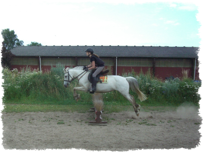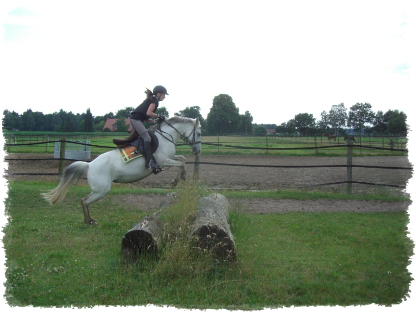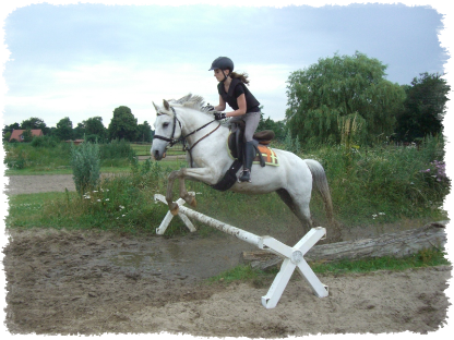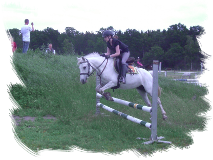 06.07.2012: Zunächst hat meine Schwester geholfen Hässi für die Springstunde fertig zu machen. Heute sprangen wir wieder die Baumstämme. Das lief solala, aber den doppelten hat sie ganz gut gemacht, ansonsten war sie viel zu düsig und unkonzentriert. Wir sprangen diesmal auch über ein Cavalettin in und aus dem Wasserloch. Ins Loch fand Hässi doof, aber es klappte dann noch. Nach dem Springen hatte Hässi Pause. Ich durfte dann noch Hoppi einmal im Abendunterricht reiten *freu*. Ich durfte auch Hässis-Sattel (den Isabell) nehmen, der passt Hoppi auch. Lief sehr gut auch der Galopp klappte auf beiden Händen. Meine Tante war heute auch zugucken und da ich mein Geld vergessen hatte, hat sie mir meine Springstunden bezahlt und geschenkt *danke ;-)*