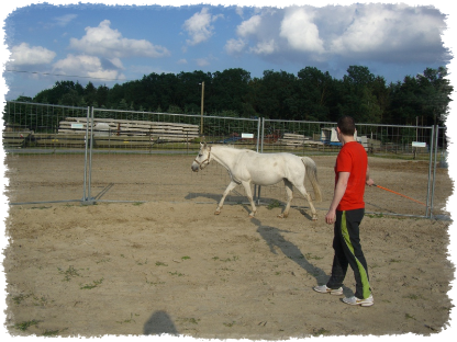 17.07.12: Reitstunde mit Laufferzügeln. Erst ritten wir auf dem Außenplatz später in der Halle. Hässi lief heute schön. In der Halle klappte auf der schlechteren linken Hand sogar 3 mal hintereinander der richtige Galopp. Am Ende durfte ich alleine mit der RL noch auf dem Außenplatz hopsen. Erst ein hohes Cavaletti, dann ein doppeltes (2 direkt hintereinader)und dann den kleinen Buschsprung. Außer das Hässi hier links wieder oft Außengalopp hatte klappte es gut.