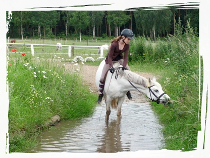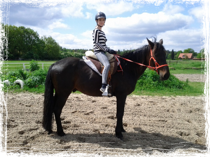 25.05.2012: Erste Springstunde mit meinem neuen Sattel. Wir haben sehr günstig einen Stübben Siegfried bekommen. Der ist zwar eigentlich etwas groß mit 17 Zoll aber damit sprigt man trotzdem besser als in meinem Isabell Dressur. Mein kleiner Ponysattel in 15 Zoll wird nun langsam echt zu klein. Meine Schwester hat den Sattel schön abgepolstert da er auch Hässi etwas zu weit ist aber so ging es uns er rutschte auch nicht auf den Hals wie die Sättel das sonst gern bei Hässi tun, vorallem mit Weidebauch. Wir hatten Traning für den Gelände-Reiter-WB für unser Hofturnier. Hate Spaß gemacht obwohl es sehr heiß war. Hässi spring Baumstämme echt am besten, besser als Stangen und auch als Cavaletties. Sie ist auch mal abgedüst und auch mal vorbei aber es war eine gute Stunde. Wir sind auch schön durchs Wasser galoppiert. Das Turnier kann kommen *freu*. Nachsten Freitag ist die 2te Einheit, hier reite ich auch wieder mit Martingal.