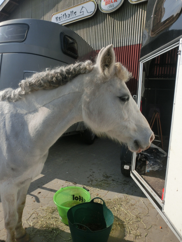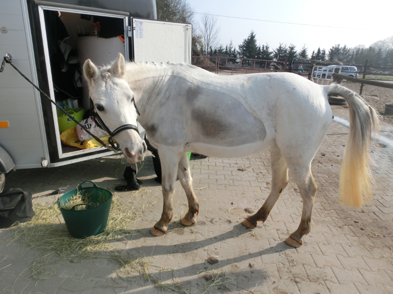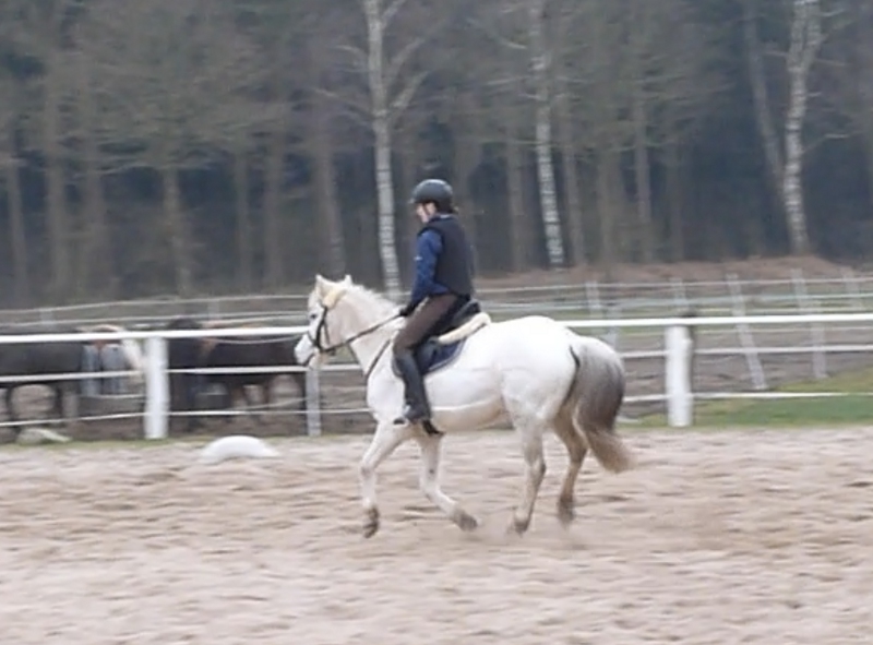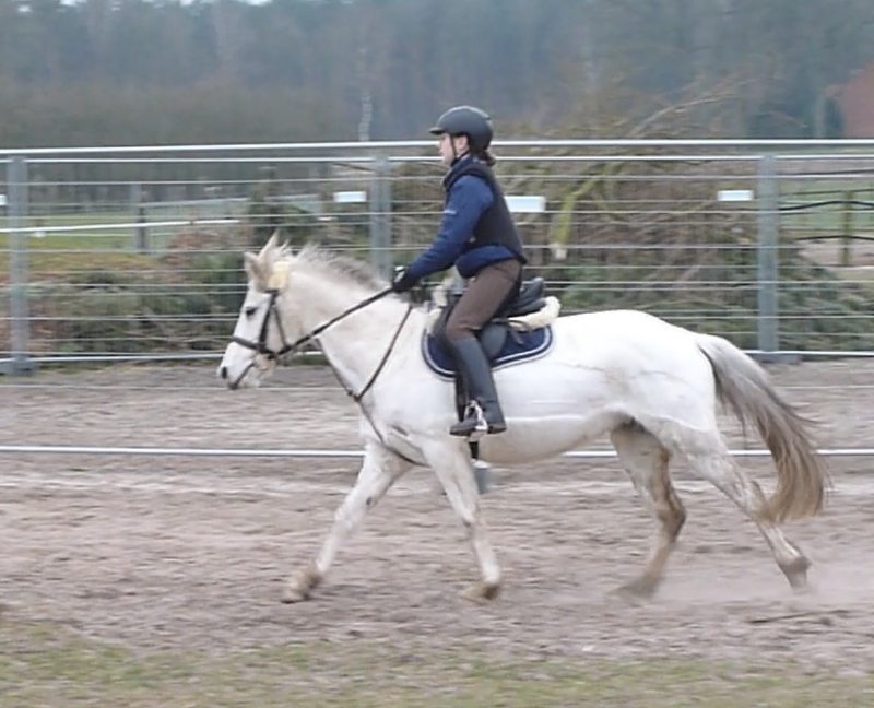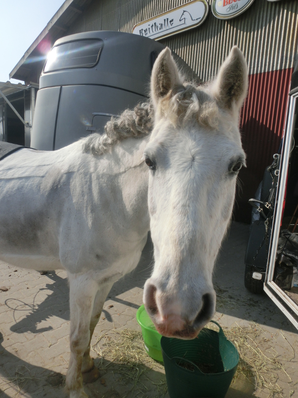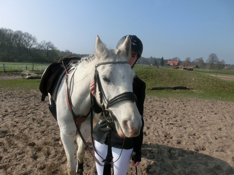 Wir testeten erst Schulpony Lotte auf dem Außenplatz. Das ging garnicht, das Pony war nicht vorwärts zu bekommen, ich konnte nichtmal antraben. Dann schneller Wechsel auf Nr. 2 Sir Henry. Etwas größer wie Häska und viel schmaler. Es ging, der Probesprung draußen war ok, aber ganz wohl war mir dabei nicht.