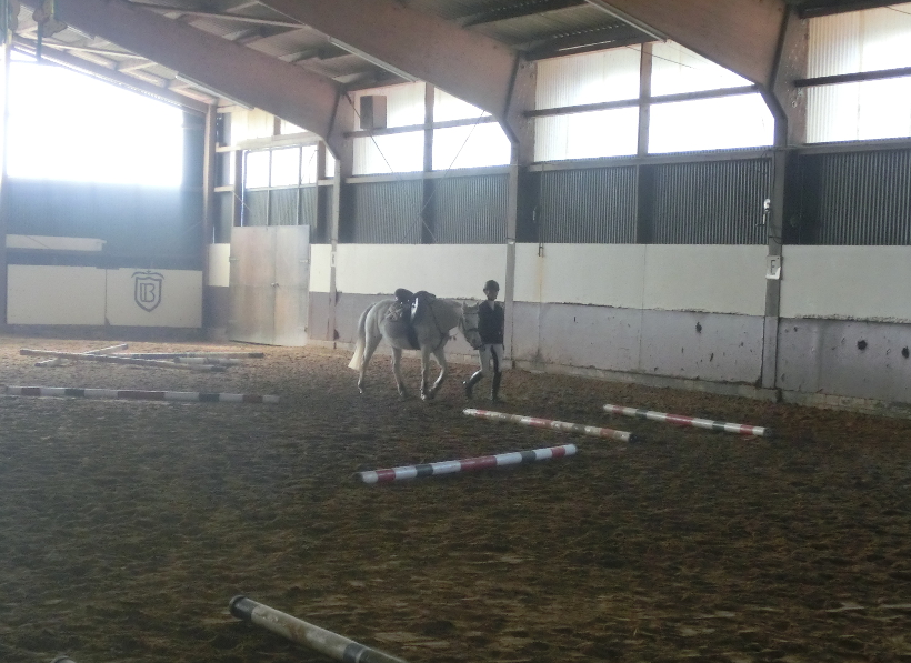 Erst kam die Bodenarbeit. Hier klappte alles gut, Häska trabte auch brav und lief keinen Passgang durch die Halle und über die Bodenstangen.